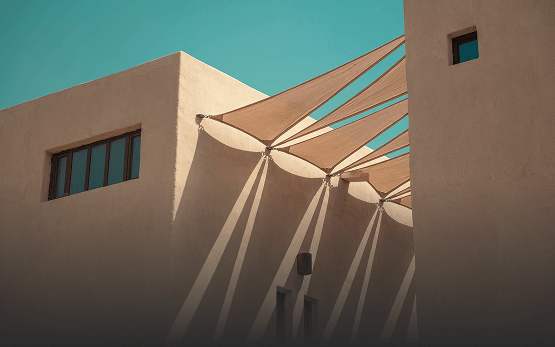 This photo showcases minimalist desert-style architecture with sand-colored walls contrasting against a vibrant blue sky.